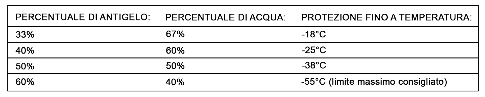 L'Antigelo blu kg.20 "puro" deve essere miscelato all'acqua con un rapporto compreso tra 60%:40% e 50%:50% , questa diluizione consente normalmente di proteggere dal gelo a temperature oscillanti tra -25 °C e -40 °C. Il rapporto di miscela antigelo/acqua minimo deve essere di 70:30 e quello massimo di 40:60. L’antigelo concentrato va sempre diluito in quanto se non fatto ghiaccia a circa -13 °C e a temperature superiori a 0 °C non sottrae sufficiente calore al motore, in questo modo il motore si surriscalda, se il prodotto è diluito correttamente il punto di ebollizione del liquido di raffreddamento è di cira 135 °C.