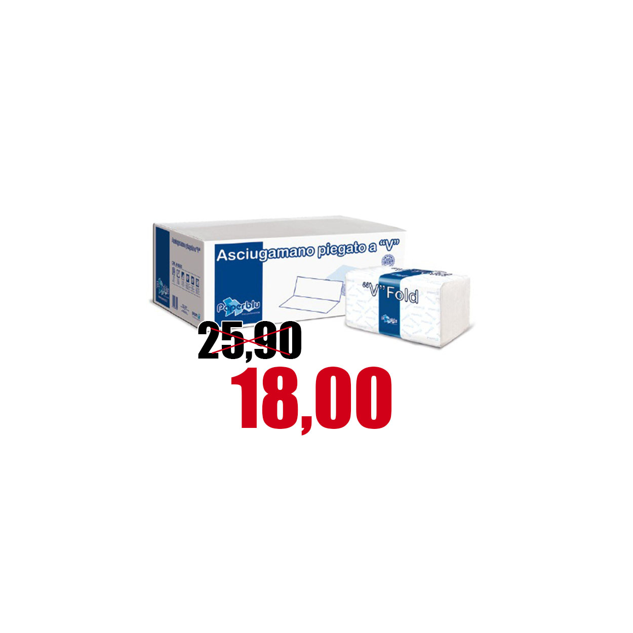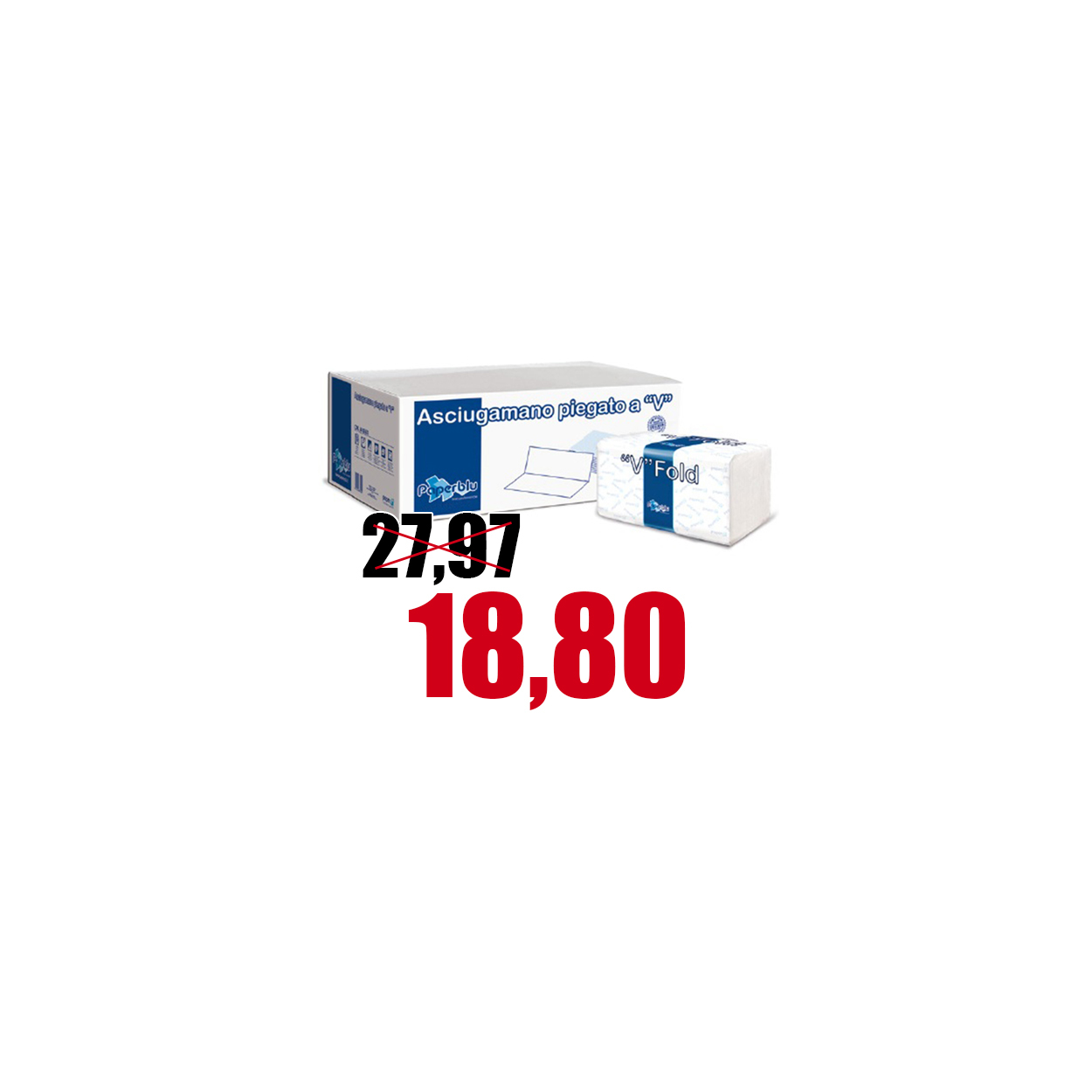 Asciugamani monouso piegati a V (interfogliati) in pura cellulosa con 2 veli microincollati fra di loro che li rendono morbidi ma al tempo stesso resistenti. in confezione da 3000 Pz. I nostri asciugamani monouso in carta sono compatibili con la maggior parte dei dispenser oggi in commercio anche se per piegature diverse. Dimentica di asciugarti con la solita carta priva di consistenza e dal colore tutt'altro che bianco in quanto i nostri asciugamani non sono fatti di carta riciclata bensì di pura cellulosa con un ottimo punto di bianco. L'asciugamano risulta essere estremamente consistente grazie ai 2 veli di cui si compone.