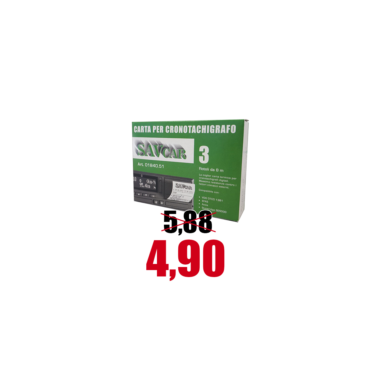 Carta termica per tachigrafo digitale in Confezione da 3 rotoli, ogni rotolo è sigillato ermeticamente in una speciale pellicola per una conservazione ottimale nel tempo. Compatibile con tutti i tachigrafi Numeri standard: E1: 84, E2: 25-29-30. E5: 0002. Larghezza: 57,5 mm, lunghezza 8 metri, I rotoli di carta termica per tachigrafi digitali sono realizzati con l’impiego di carta termica speciale resistente agli agenti atmosferici, agli agenti chimici, alle basse ed alte temperature. I rotoli carta tachigrafo sono omologati per essere utilizzati nelle seguenti stampanti ed apparecchiature: