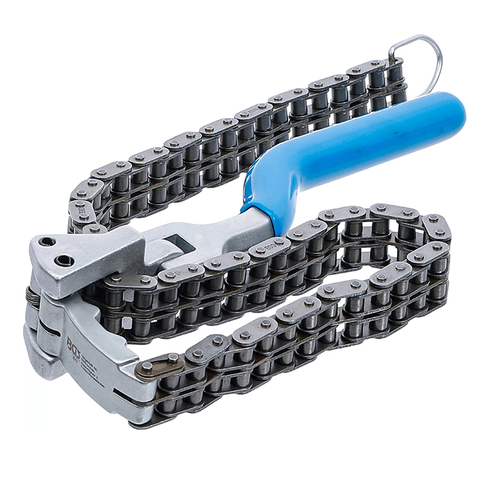 Chiave a catena professionale per filtri olio utile per lo smontaggio di filtri olio di diametro da 60 fino a 160 mm. Per poter procedere allo smontaggio si posiziona l'anello della catena intorno al filtro e si ruota la barra in senso antiorario a mano fino a quando la catena si avvolge strettamente attorno al filtro. La barra si serra ulteriormente con una chiave a tubo per aumentare la tensione della catena. Questo scende nella custodia in metallo morbido del filtro dell'olio, riducendo la possibilità di slittamento. La chiave a catena funziona su una varietà di dimensioni del filtro dell'olio ed è utile per i filtri dell'olio che sono estremamente grassi.