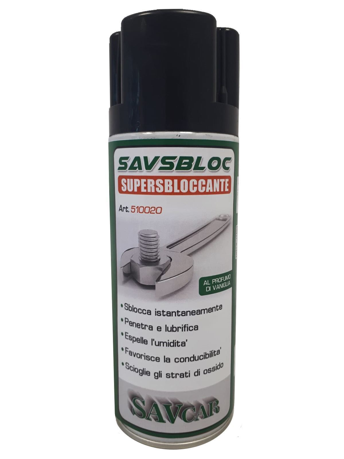 Super Sbloccante "SAVSBLOC" con MOS2 spray ml.400 ad alto potere penetrante sblocca istantaneamente, penetra e lubrifica, espelle l'umidità, scioglie gli strati di ossido dissolve ruggine e ossidazioni con estrema rapidità su bulloni, dadi, giunzioni, componenti arrugginiti di motori, bicchieri di iniettori su motori diesel, candelette di pre-riscaldamento. Particolarmente aggressivo nei confronti dell’ossido di ferro (ruggine) penetra nei filetti sbloccando ogni accoppiamento. Grazie alla sua formula speciale lubrifica a fondo e con il suo alto potere penetrante si espande nei posti di più difficile accesso eliminando fastidiosi cigolii e attriti. Ha proprietà altamente idroespellenti e e quindi con il suo potente getto espelle totalmente l'umidità e acqua dai contatti elettrici formando una pellicola protettiva che ne favorisce la miglior conducibilità