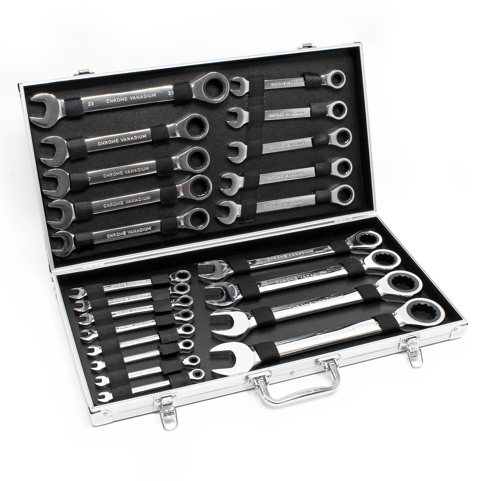 Set chiavi combinate a cricchetto da 22 pezzi fabbricate in acciaio forgiato caratterizzate da una particolare robustezza poichè temprate e rivestite con nichel, dunque inossidabili, a prova di usura. Un lato delle chiavi è a U (o a forchetta) e ha un range di dimensioni compreso tra 6 e 32 mm. L'altro lato delle chiavi è a cricchetto con 72 dentini.